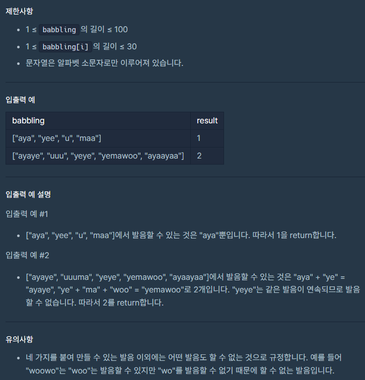 머쓱이는 태어난 지 11개월 된 조카를 돌보고 있습니다. 조카는 아직 "aya", "ye", "woo", "ma" 네 가지 발음과 네 가지 발음을 조합해서 만들 수 있는 발음밖에 하지 못하고 연속해서 같은 발음을 하는 것을 어려워합니다. 문자열 배열 babbling이 매개변수로 주어질 때, 머쓱이의 조카가 발음할 수 있는 단어의 개수를 return하도록 solution 함수를 완성해주세요.