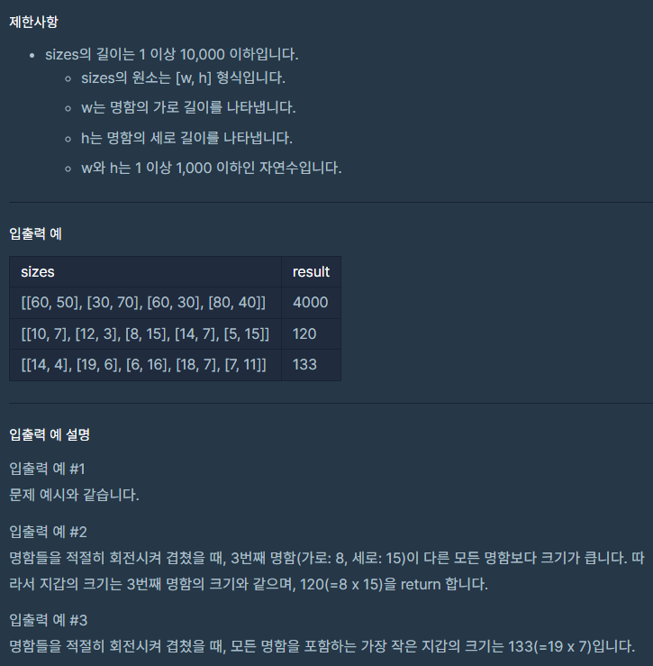 모든 명함의 가로 길이와 세로 길이를 나타내는 2차원 배열 sizes가 매개변수로 주어집니다. 모든 명함을 수납할 수 있는 가장 작은 지갑을 만들 때, 지갑의 크기를 return 하도록 solution 함수를 완성해주세요.