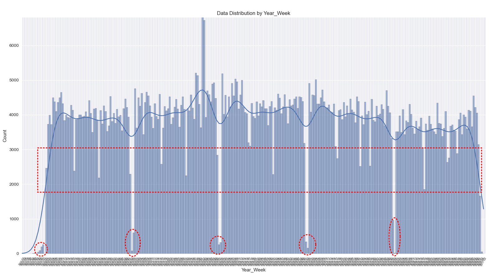 [Order Demand 관점] Order Demand 데이터는 시간별로 고르게 분포되어있나? 2011, 2017년은 데이터가 부족 매 년 1~3번째 주, 17~20째 주 사이 데이터 수가 급감하는 경향