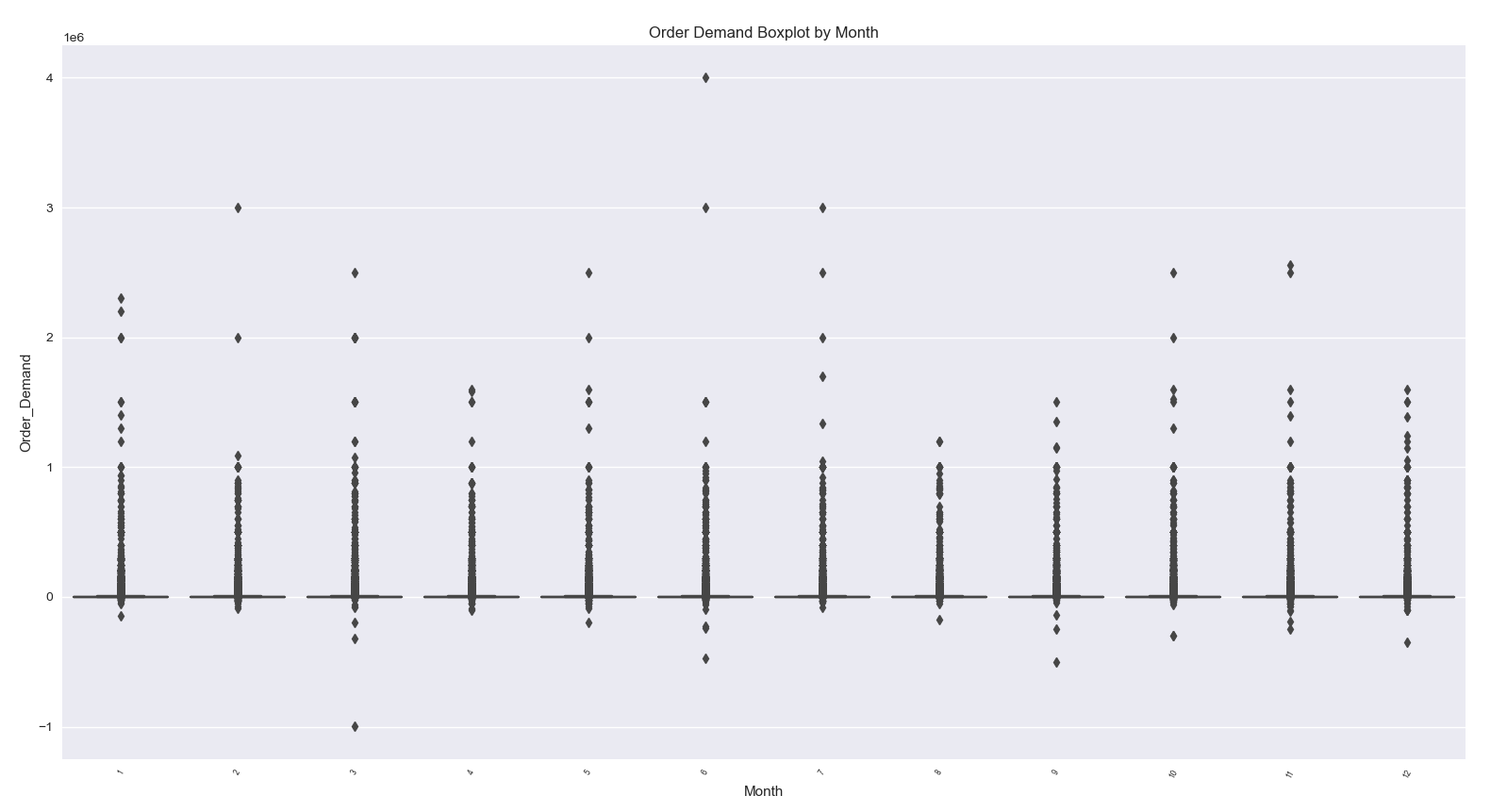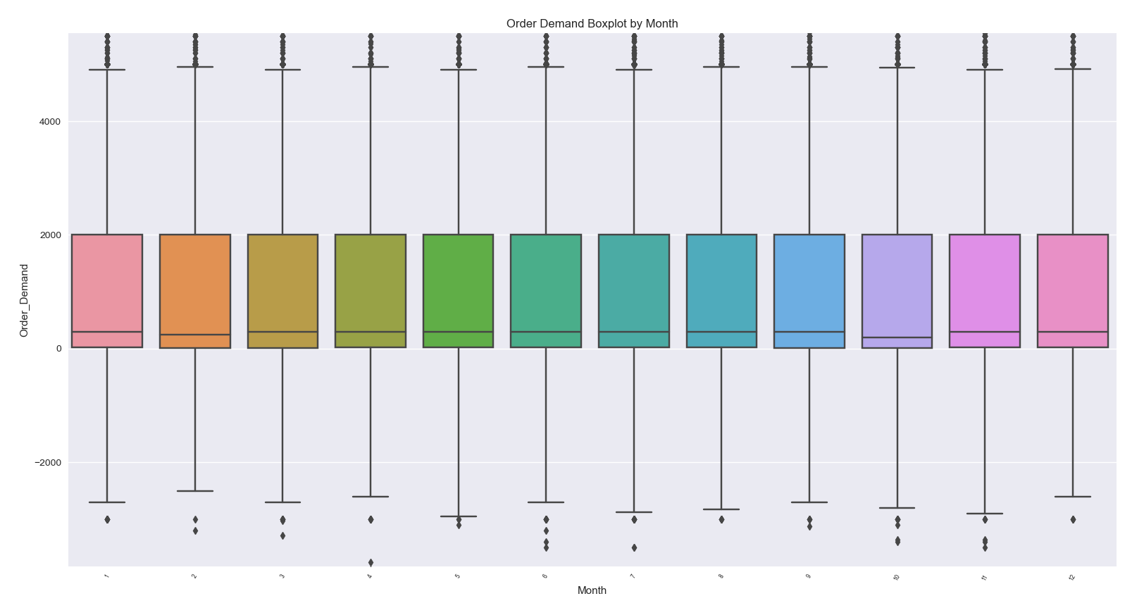 10월 order demand median이 상대적으로 낮아지는 경향이 있음 On a weekly basis 52, 53주차 (연말)에 Q3, median이 높아지는 경향이 있음 On a daily basis 토요일(5)에 Order Demand가 가장 적음 Interquartile range, median, 1.5*IQR whisker관점에서 평일은 차이가 없음 FYI) Mon 0 - Sun = 6