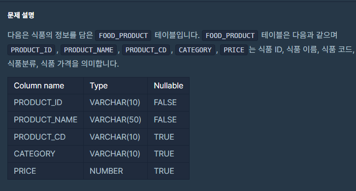 가격이 제일 비싼 식품의 정보 출력하기 >> 코딩테스트 연습 SUM, MAX, MIN 본문