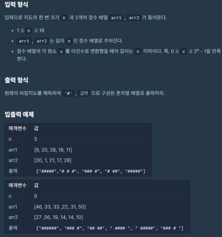 네오는 평소 프로도가 비상금을 숨겨놓는 장소를 알려줄 비밀지도를 손에 넣었다. 그런데 이 비밀지도는 숫자로 암호화되어 있어 위치를 확인하기 위해서는 암호를 해독해야 한다. 다행히 지도 암호를 해독할 방법을 적어놓은 메모도 함께 발견했다. 지도는 한 변의 길이가 n인 정사각형 배열 형태로, 각 칸은 "공백"(" ") 또는 "벽"("#") 두 종류로 이루어져 있다.전체 지도는 두 장의 지도를 겹쳐서 얻을 수 있다. 각각 "지도 1"과 "지도 2"라고 하자.
