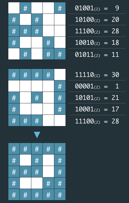 1. 지도 1 또는 지도 2 중 어느 하나라도 벽인 부분은 전체 지도에서도 벽이다. 2. 지도 1과 지도 2에서 모두 공백인 부분은 전체 지도에서도 공백이다. 3. "지도 1"과 "지도 2"는 각각 정수 배열로 암호화되어 있다. 4. 암호화된 배열은 지도의 각 가로줄에서 벽 부분을 1, 공백 부분을 0으로 부호화했을 때 얻어지는 이진수에 해당하는 값의 배열이다.