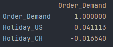 중국 창고 데이터일까 미국 창고 데이터일까? 날짜별 Order_Demand와 미국/중국 공휴일 여부를 토대로 상관계수를 살펴봄 현재 기초적인 데이터에서는 특징적인 상관계수가 나타나지 않았음
