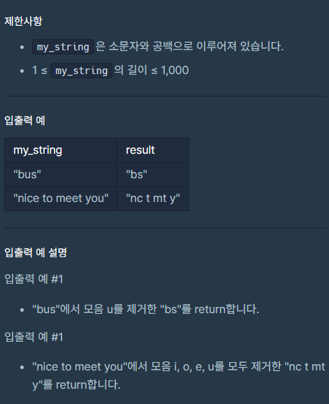 모음 제거 / 프로그래머스, 파이썬 코딩테스트 연습코딩테스트 입문 본문