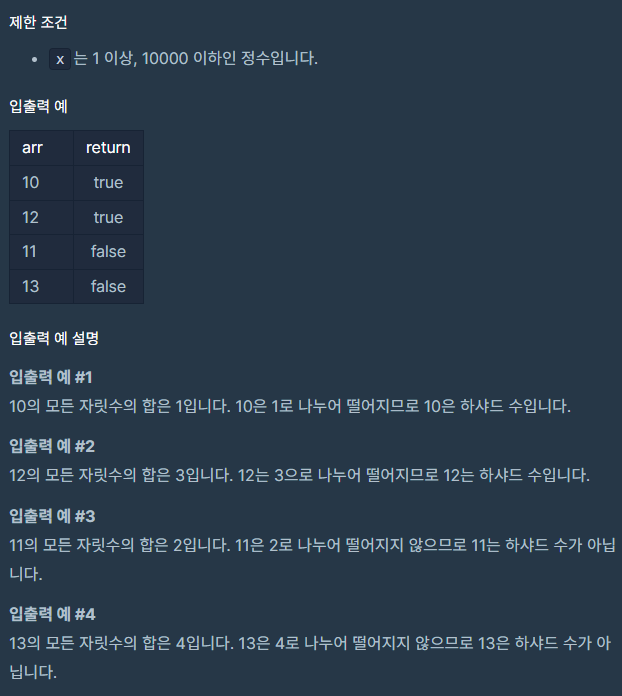 하샤드 수 / 프로그래머스, 파이썬 코딩테스트 연습 연습문제 본문