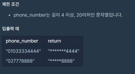 프로그래머스 모바일은 개인정보 보호를 위해 고지서를 보낼 때 고객들의 전화번호의 일부를 가립니다.