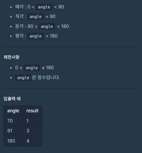 angle 이 매개변수로 주어질 때 예각일 때 1, 직각일 때 2, 둔각일 때 3, 평각일 때 4를 return하도록 solution 함수를 완성해주세요.