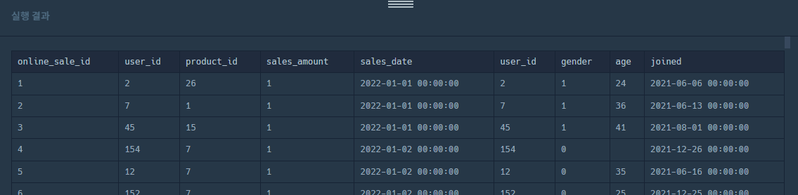SELECT * FROM online_sale AS os JOIN user_info AS ui ON os.user_id = ui.user_id