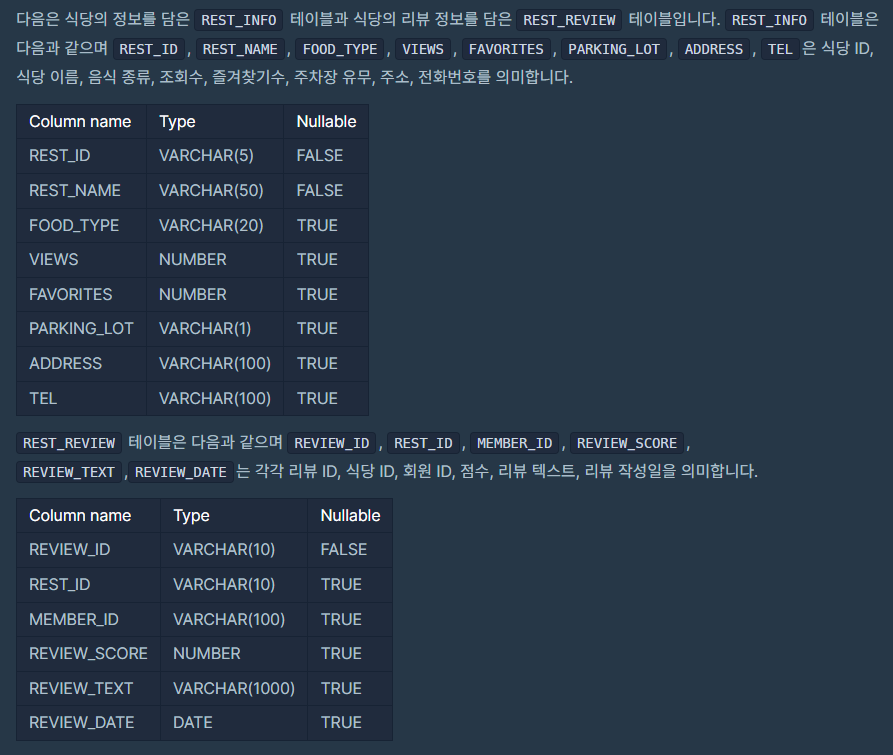 서울에 위치한 식당 목록 출력하기 / 프로그래머스, SQL 코딩테스트 연습SELECT 본문