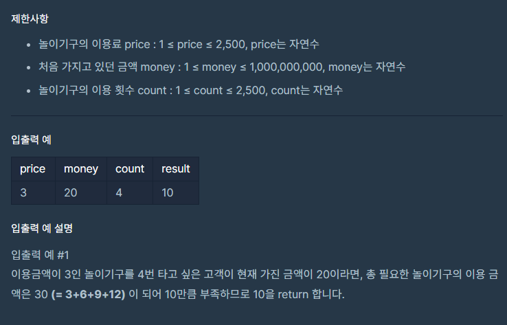 놀이기구를 count번 타게 되면 현재 자신이 가지고 있는 금액에서 얼마가 모자라는지를 return 하도록 solution 함수를 완성하세요.