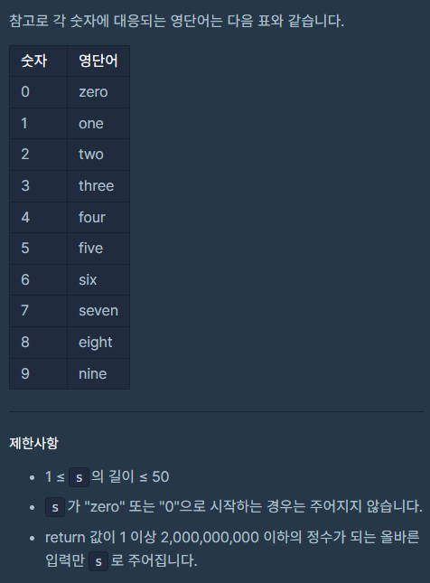이렇게 숫자의 일부 자릿수가 영단어로 바뀌어졌거나, 혹은 바뀌지 않고 그대로인 문자열 s가 매개변수로 주어집니다. s가 의미하는 원래 숫자를 return 하도록 solution 함수를 완성해주세요.