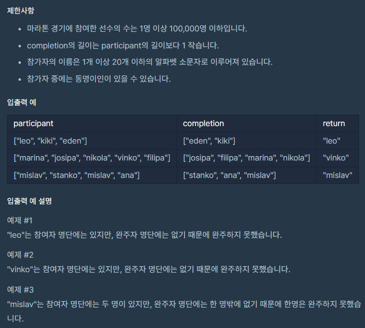 수많은 마라톤 선수들이 마라톤에 참여하였습니다. 단 한 명의 선수를 제외하고는 모든 선수가 마라톤을 완주하였습니다. 마라톤에 참여한 선수들의 이름이 담긴 배열 participant와 완주한 선수들의 이름이 담긴 배열 completion이 주어질 때, 완주하지 못한 선수의 이름을 return 하도록 solution 함수를 작성해주세요.